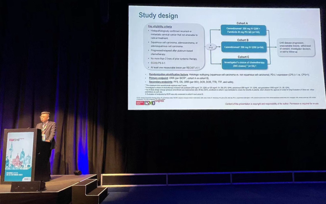 有望为宫颈癌患者带来治疗新选择10月22日,金年会医药创新药卡瑞利珠单抗联合法米替尼对比卡瑞利珠单抗单药或研究者选择的化疗治疗复发转移性宫颈癌随机、开放、对照、多中心的Ⅱ期临床研究(SHR-1210-Ⅱ-217) 亮相2023 ESMO大会简短口头报告现场3。该研究由复旦大学附属肿瘤医院吴小华教授团队开展,吴小华教授在现场公布了该重磅研究进展。研究结果显示,在既往以铂为基础化疗失败后复发或转移性宫颈癌患者中,与单独使用卡瑞利珠单抗或研究者选择的化疗相比,卡瑞利珠单抗联合法米替尼显著提高了抗肿瘤活性,安全性可控,有望为晚期宫颈癌患者提供新的治疗选择。
